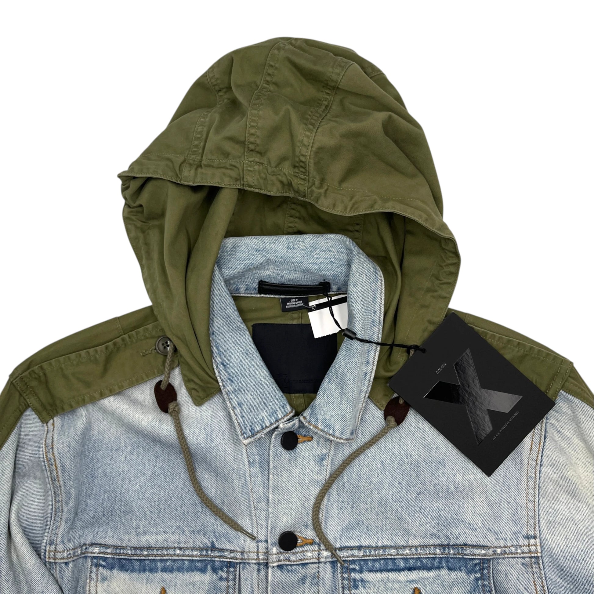 - Light-wash denim on the front & army-green cotton parka on the back