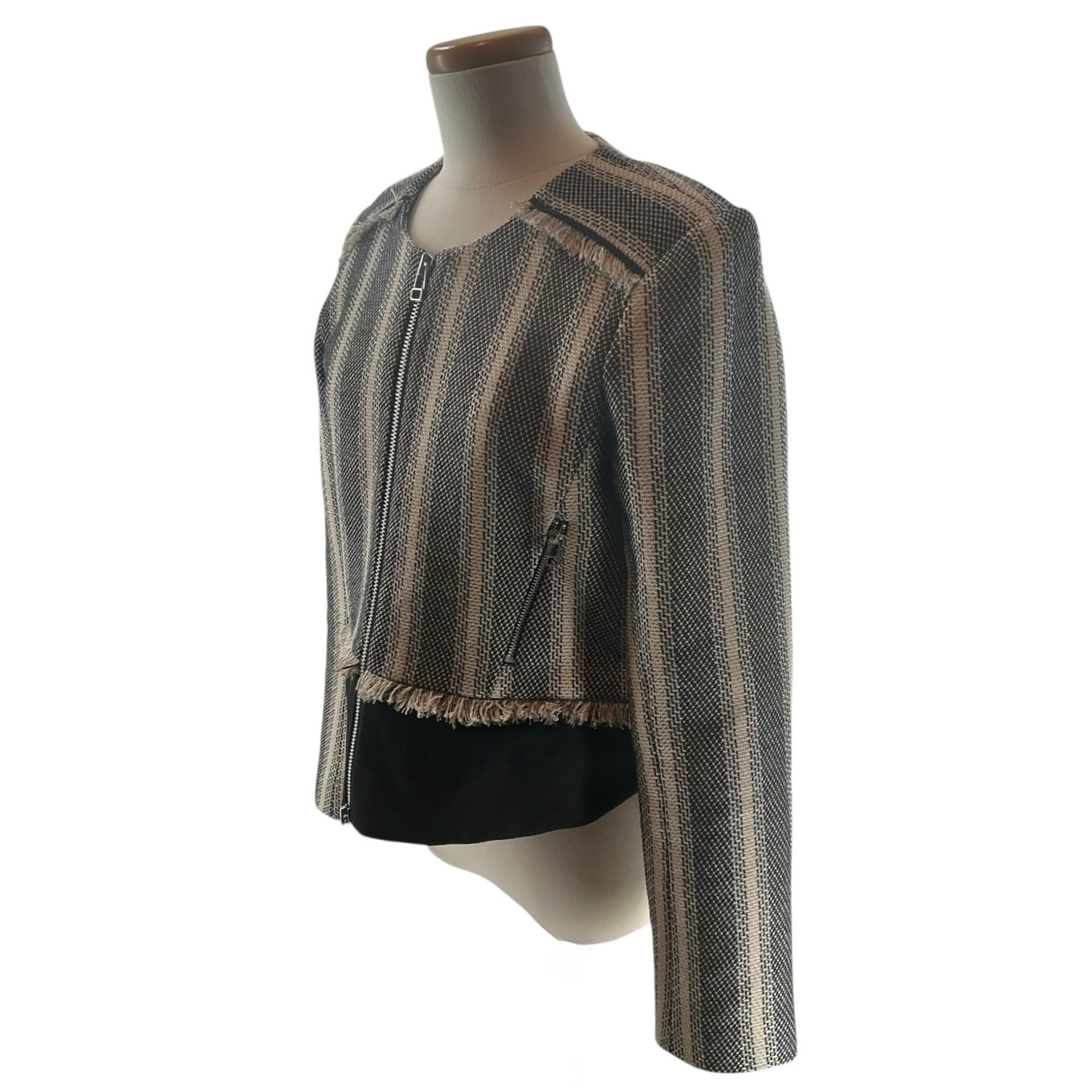 Tweed jacket with a round, collarless neckline and fringed edges.